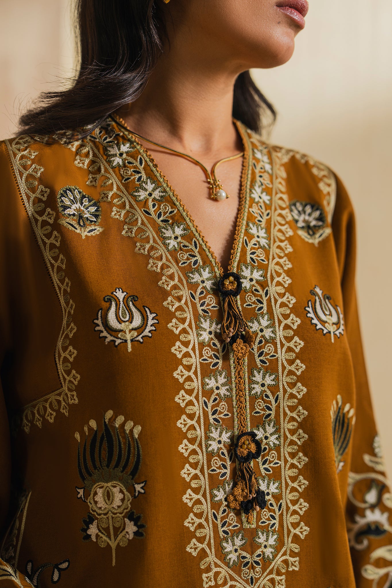 Bathed in warm amber-brown tones, this airy Irish linen two-piece flows with effortless grace. Delicate ivory and soft sage embroidery bloom across the front and sleeves, while discreet side pockets add ease to its refined silhouette.