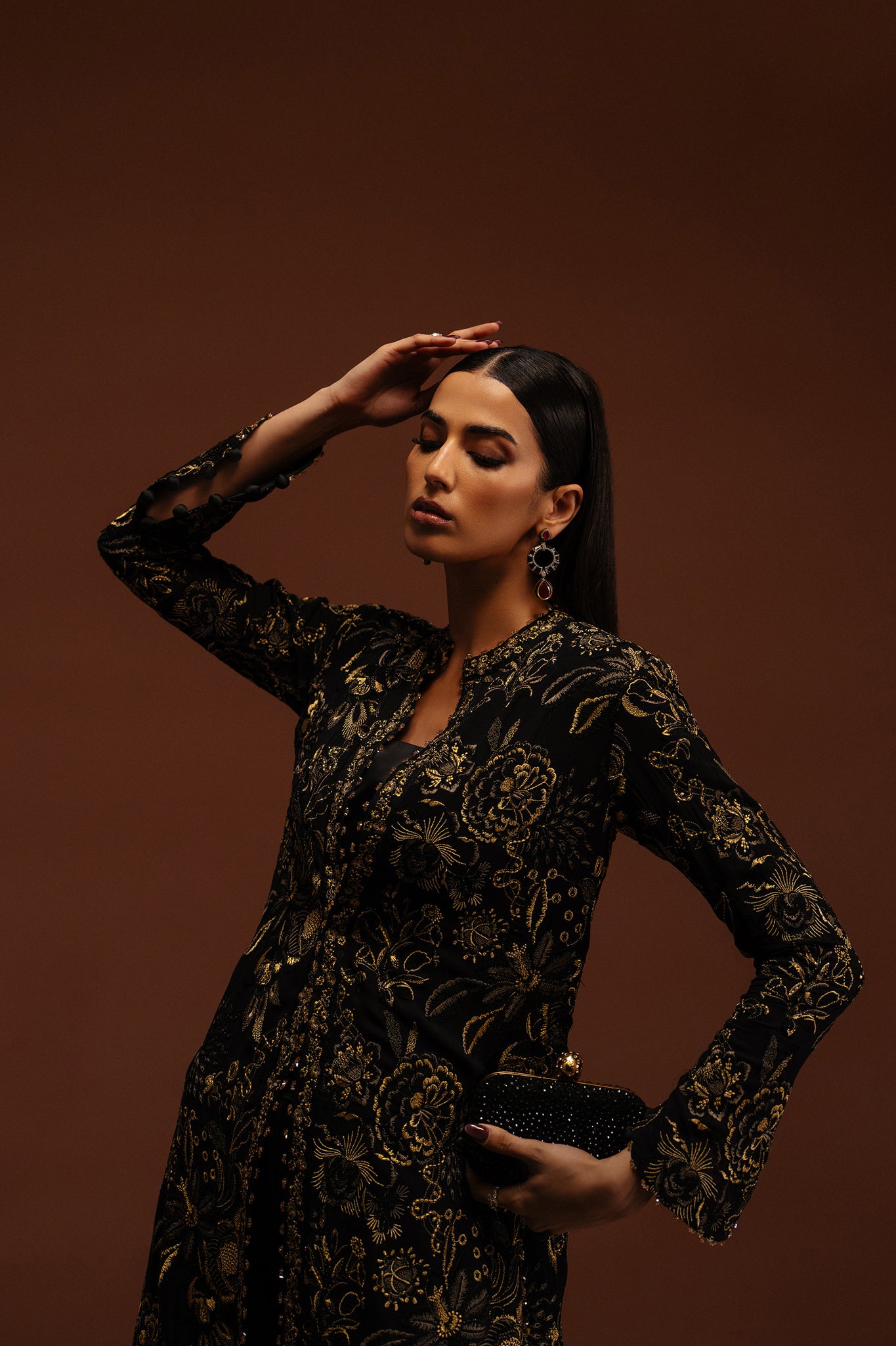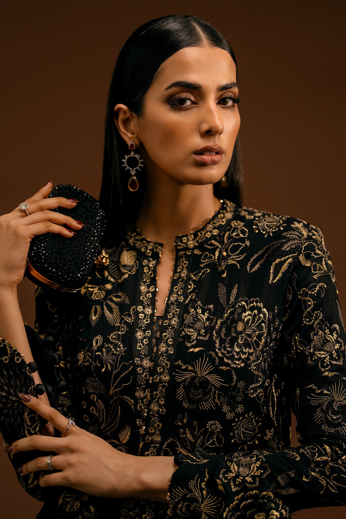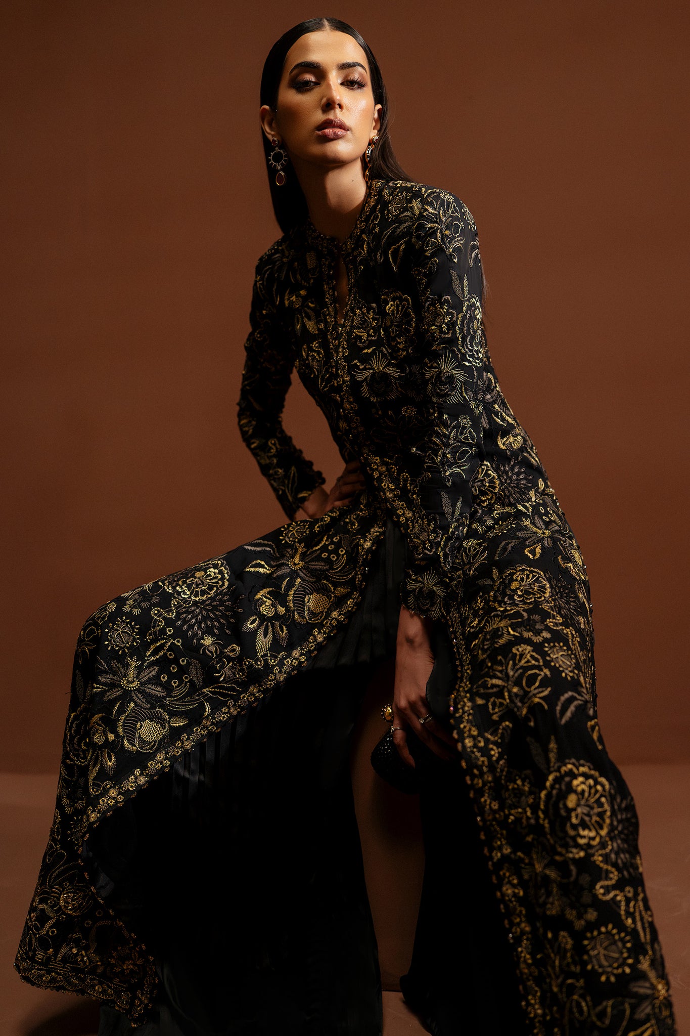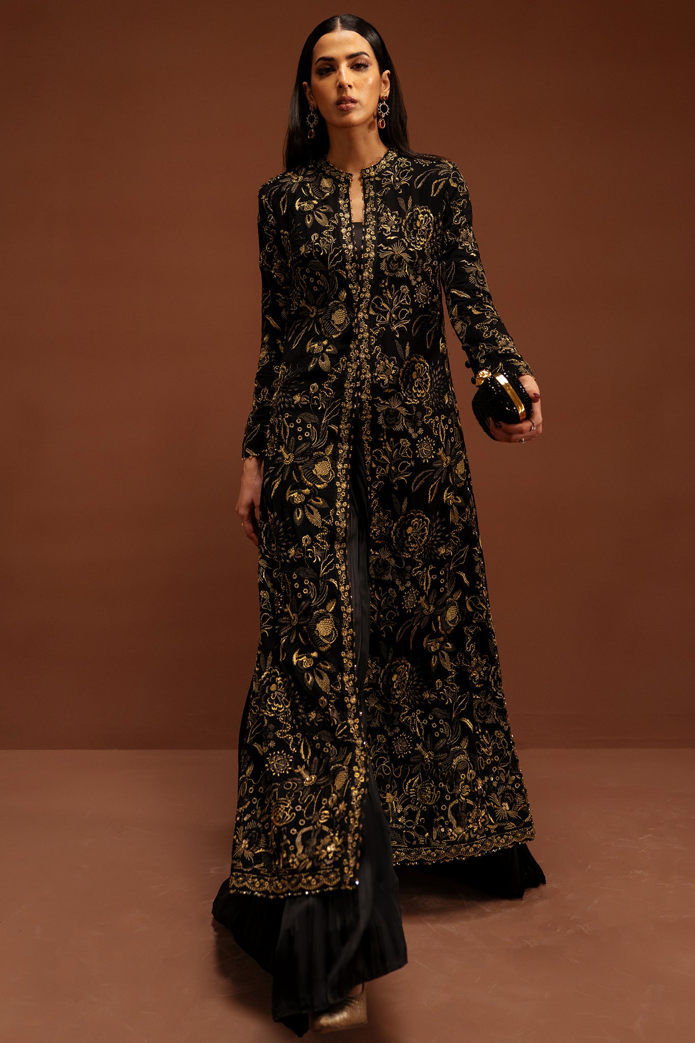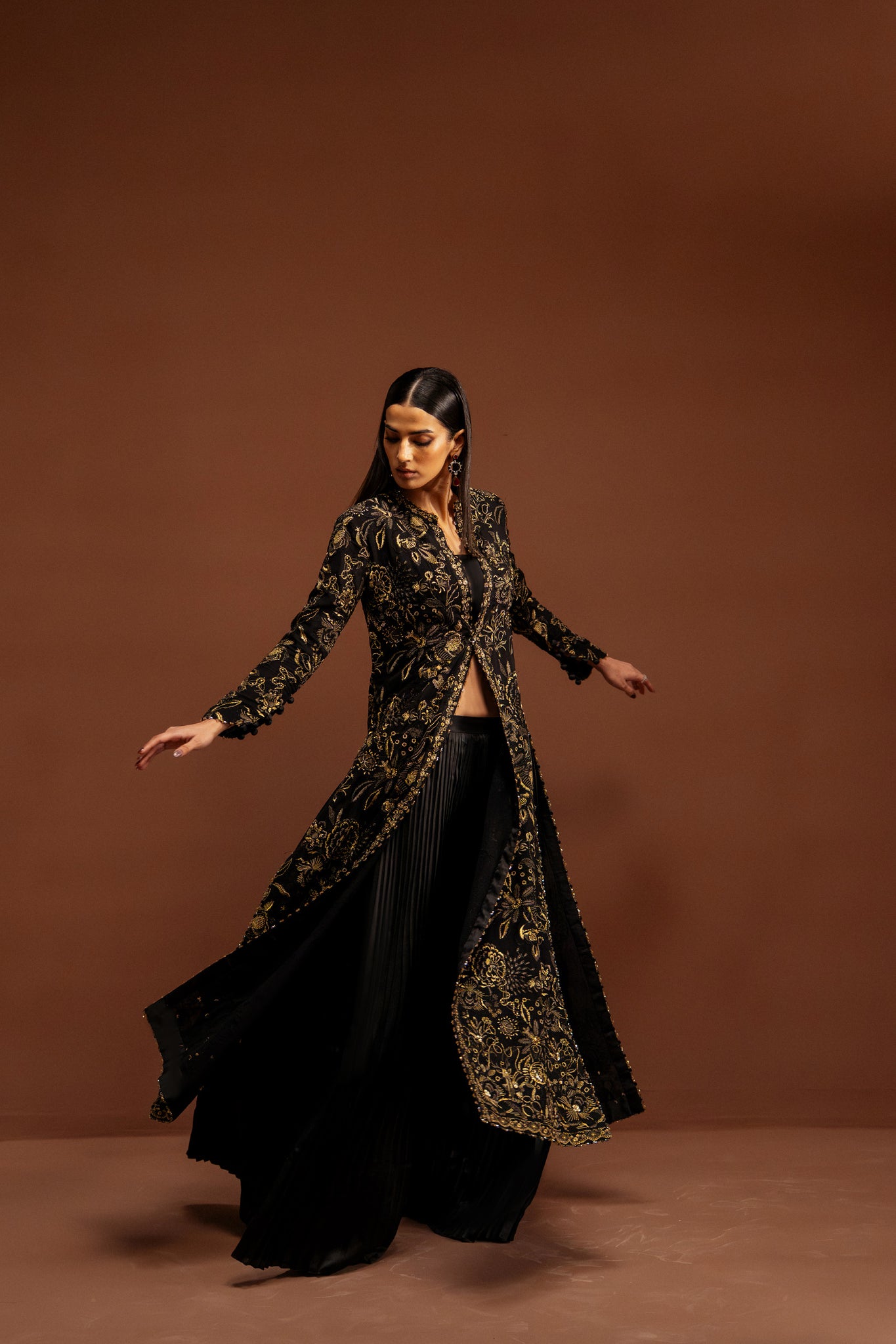 Étoile Dorée unfolds on a deep, inky canvas, illuminated by glistening gold tilla and refined threadwork embroidery that traces florals with quiet brilliance. The composition is rich yet composed—each motif placed with intention, creating a seamless dialogue between structure and softness.