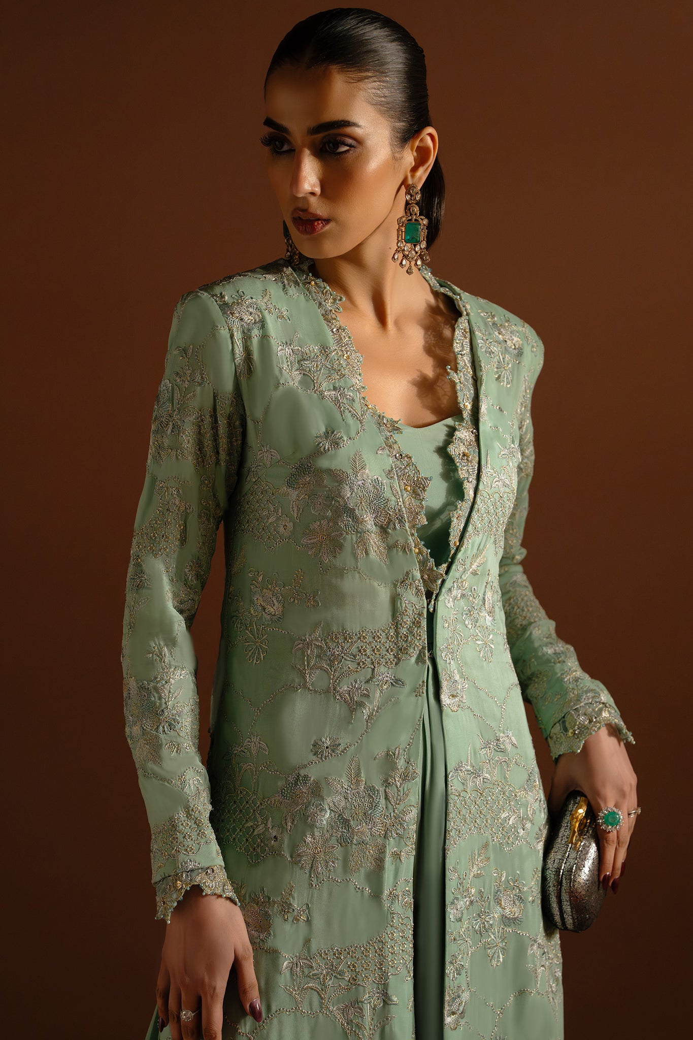 Immerse yourself in the ethereal allure of Lune Blanche, where delicate florals drift across a serene celestial mint canvas like moonlit impressions. Fine silver tilla embroidery glistens softly, tracing each motif with a luminous precision that feels both graceful and captivating.