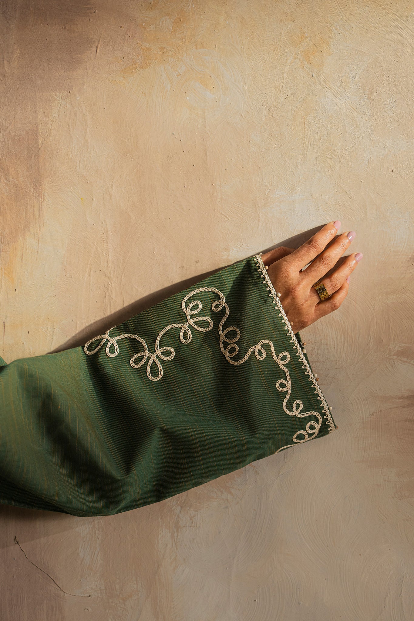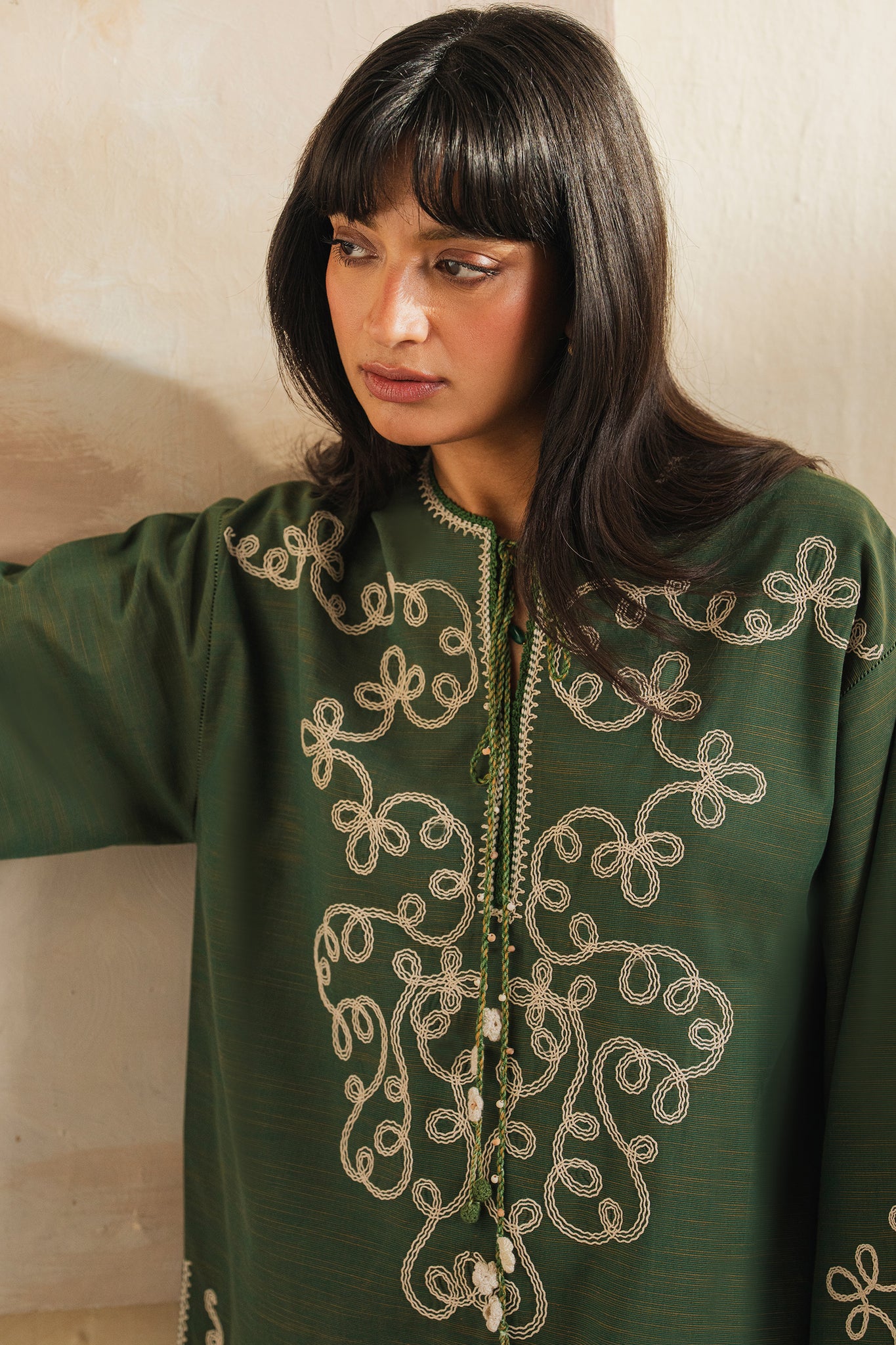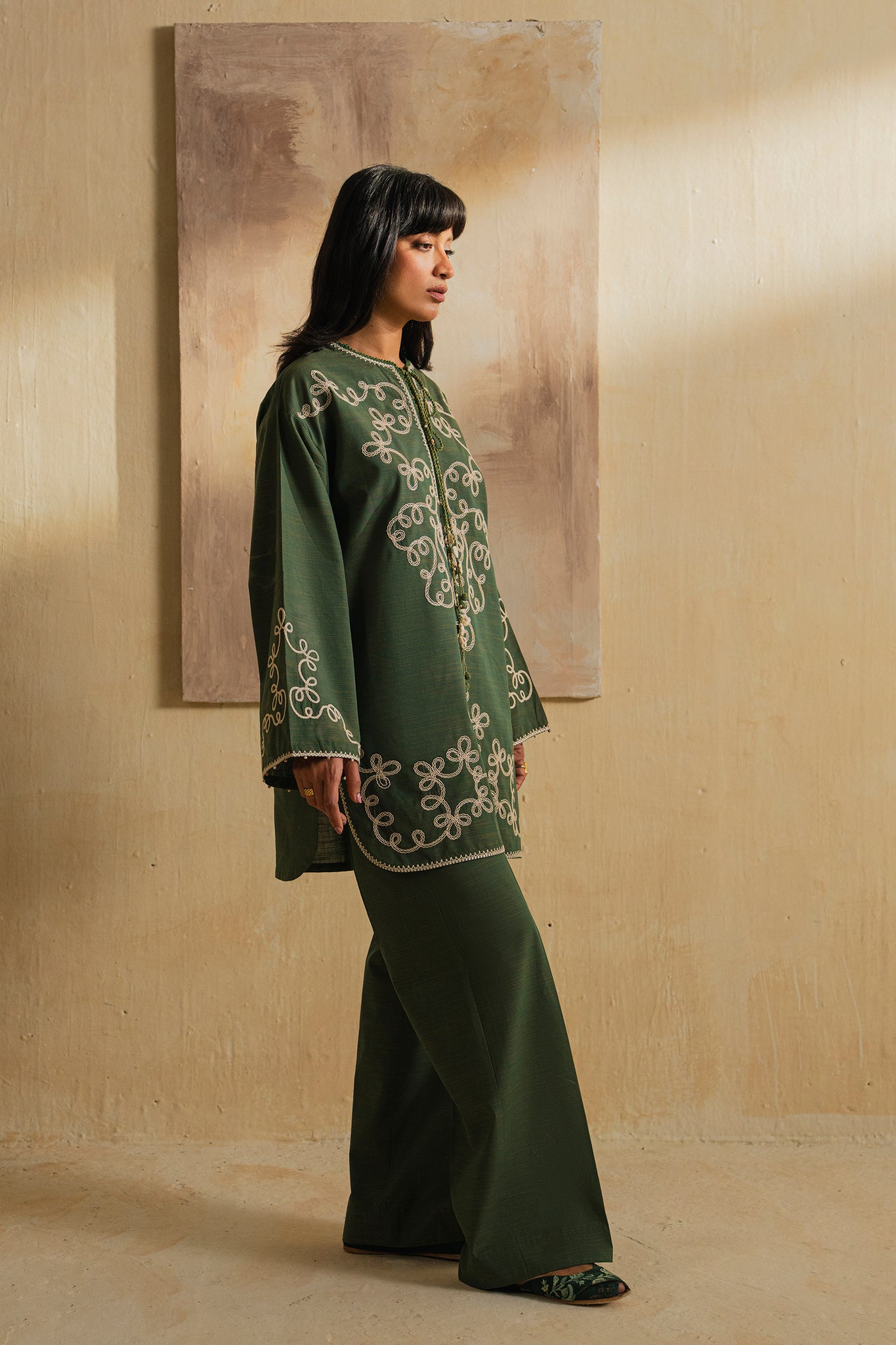 Draped in deep olive, this airy 2-piece in yarn-dyed slub exudes serene elegance. Ivory embroidery meanders like delicate vines across the front and sleeves, adding subtle movement to every gesture.