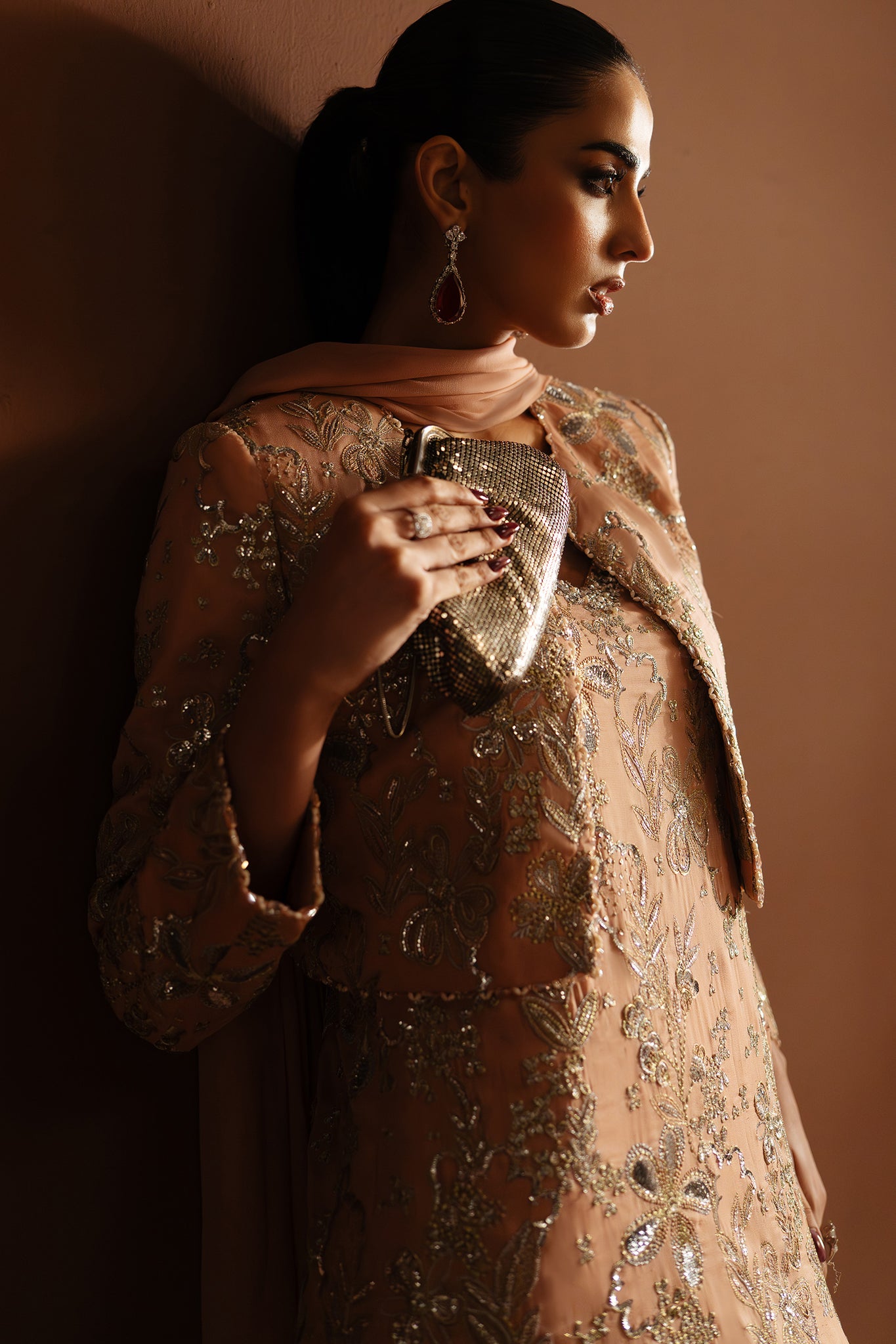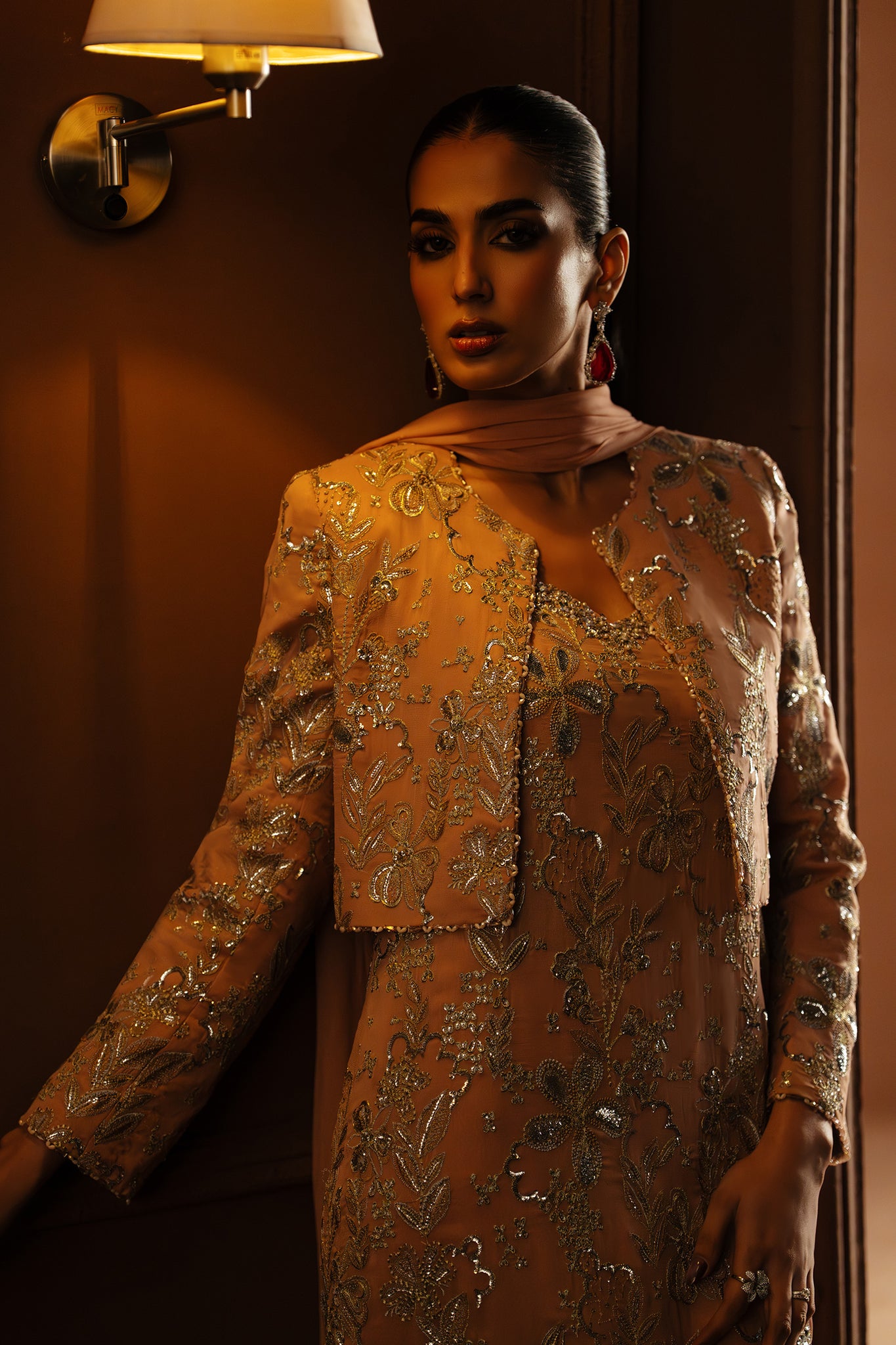 Rosée Sérénité is crafted on a tender blush canvas, delicately illuminated with fine tilla and threadwork embroidery that flows across the surface in intricate, floral-inspired patterns. The detailing feels light yet luminous, lending the ensemble an air of effortless refinement and quiet romance.