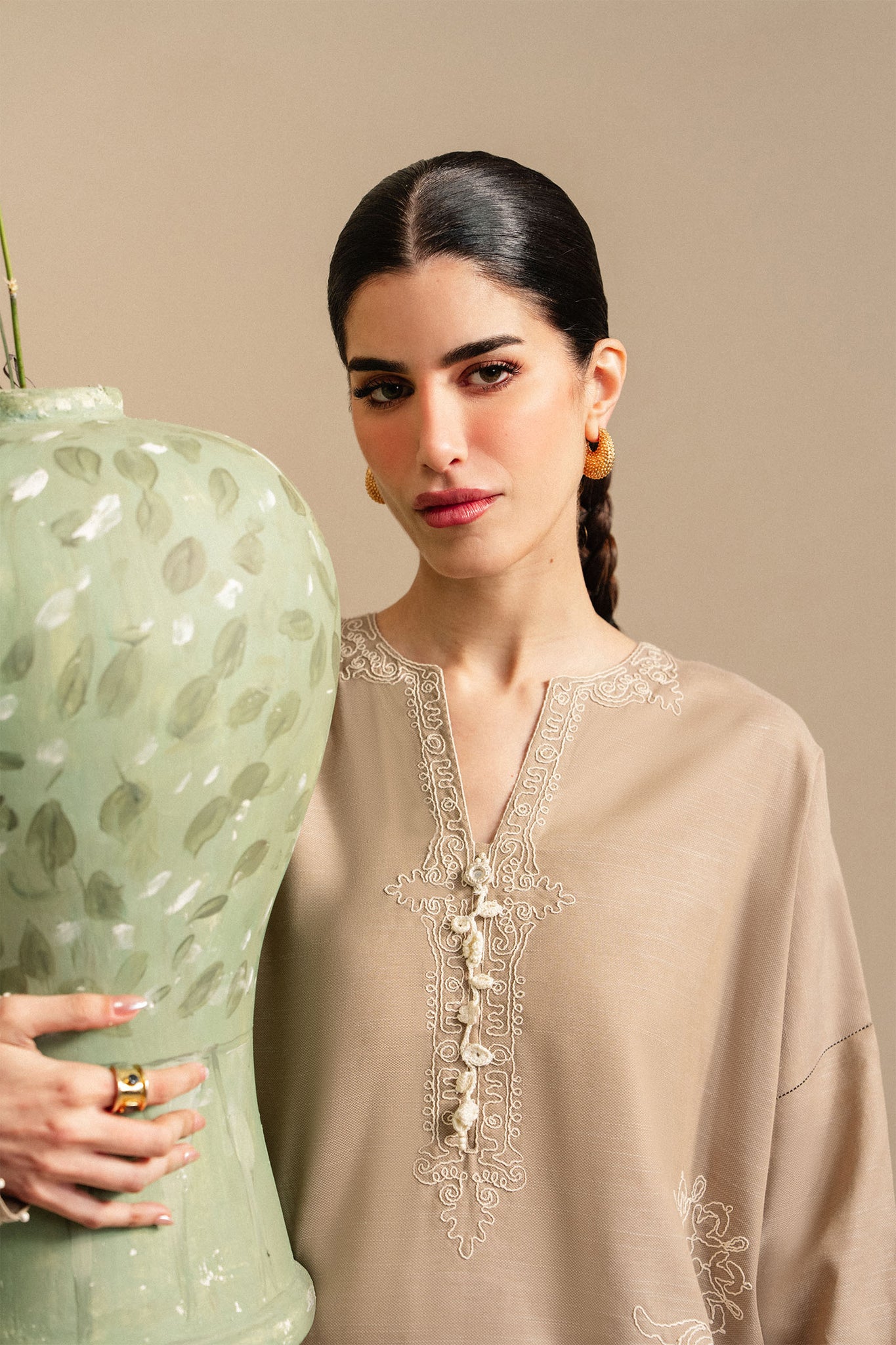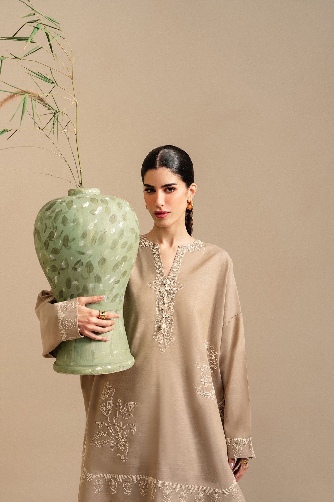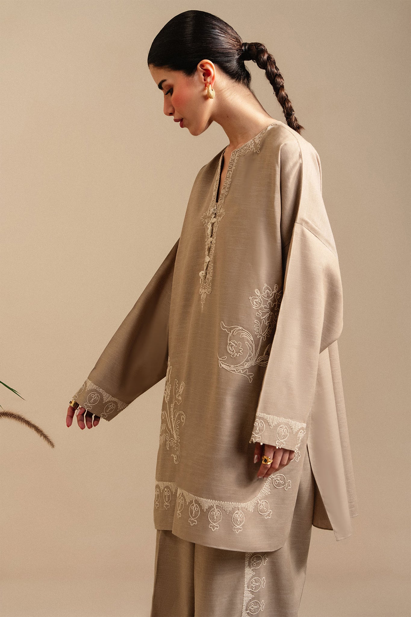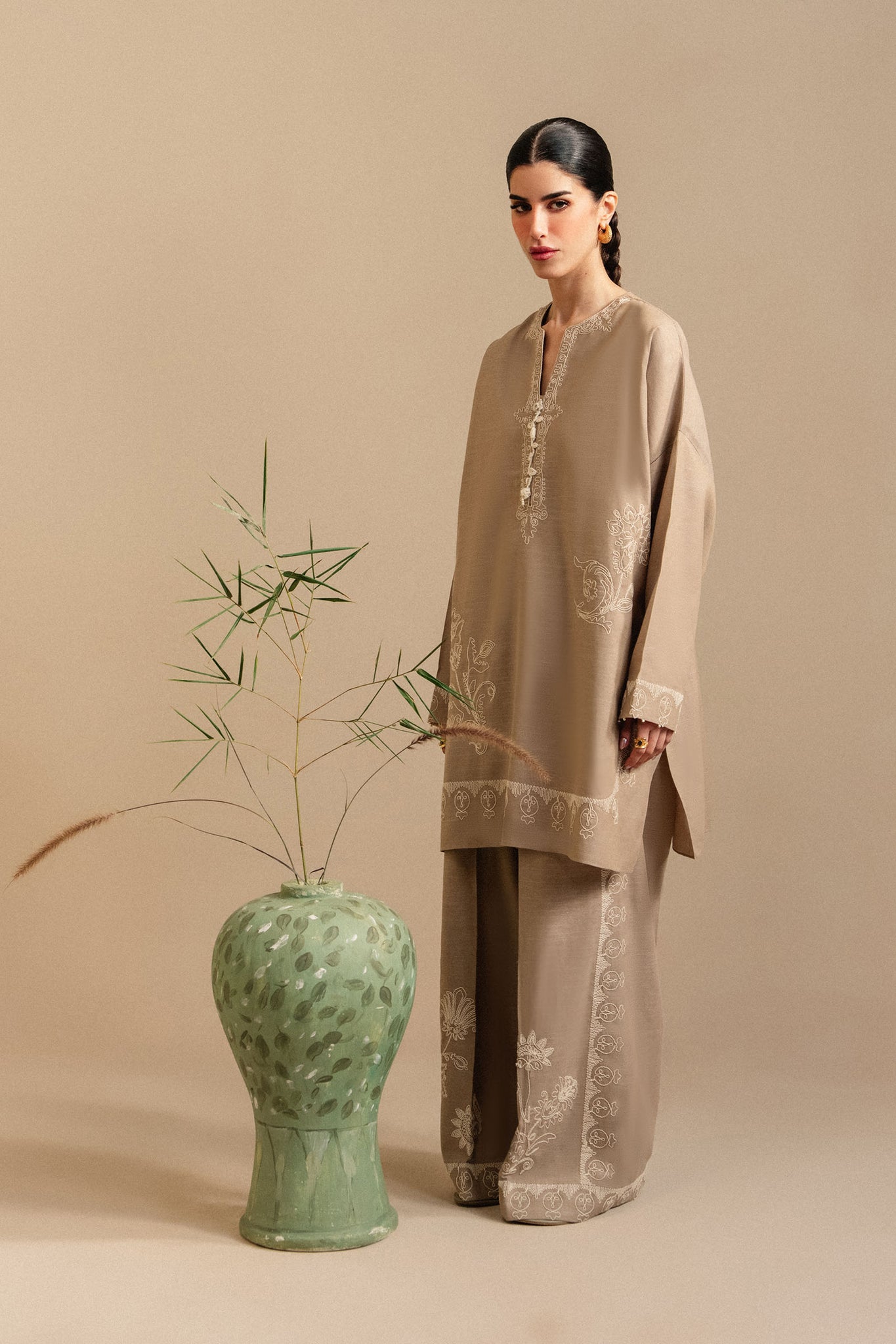 **Aziya — a muted sand-toned winter set adorned with delicate tonal embroidery, where soft paisley vines and scalloped borders lend quiet sophistication. The relaxed silhouette, fluid trousers, and intricately detailed neckline create an effortlessly polished, understated luxe look.**