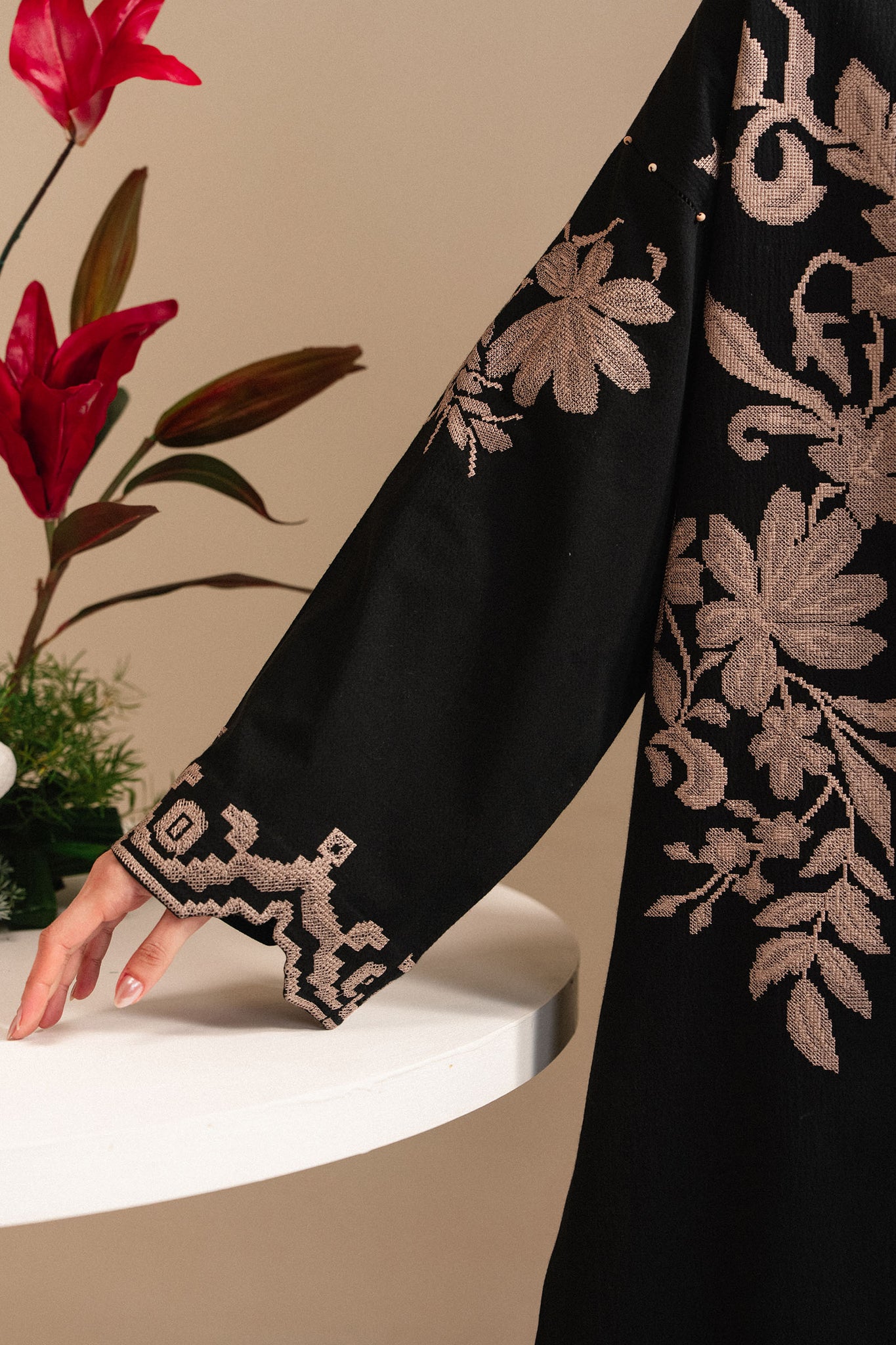 Draped in deep black canvas, Reya moves like a serene winter night. Soft cream floral embroideries bloom delicately at the neckline, glowing against the rich darkness, while black scalloped embroidered pants add subtle depth and texture.