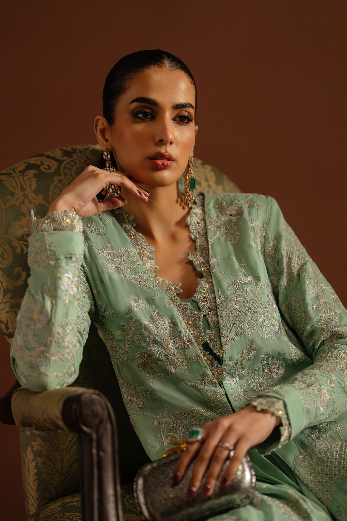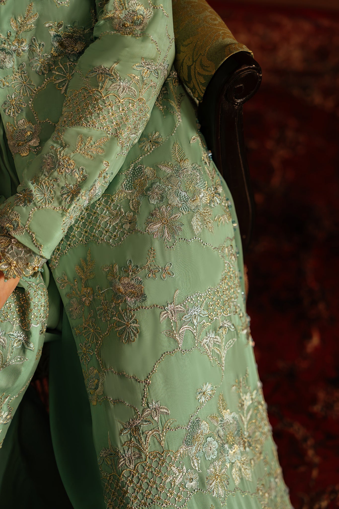 Immerse yourself in the ethereal allure of Lune Blanche, where delicate florals drift across a serene celestial mint canvas like moonlit impressions. Fine silver tilla embroidery glistens softly, tracing each motif with a luminous precision that feels both graceful and captivating.